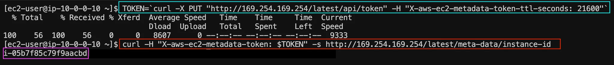 [ec2-user@ip-10-0-0-10 ~]$ curl -H "X-aws-ec2-metadata-token: $TOKEN" -s http://169.254.169.254/latest/meta-data/instance-id