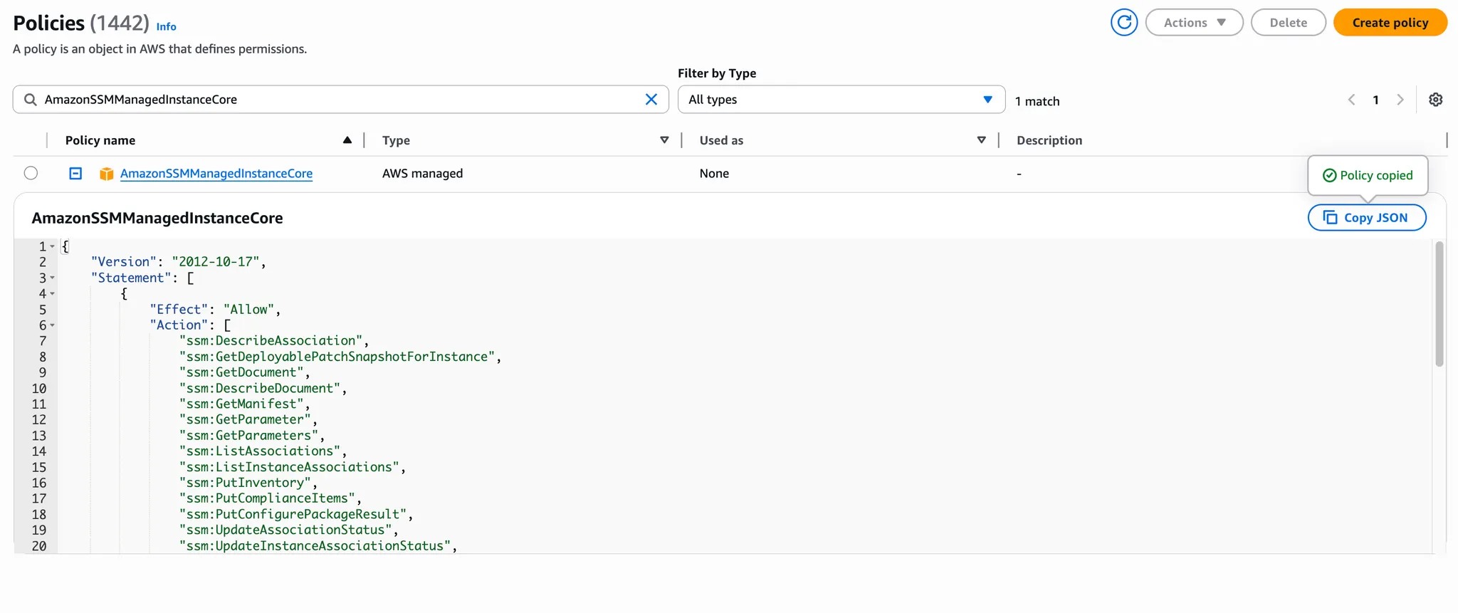AmazonSSMManagedInstanceCore policies 세부 목록 (이름에 'Core'가 들어간 게 최신 경량화 버전입니다.)