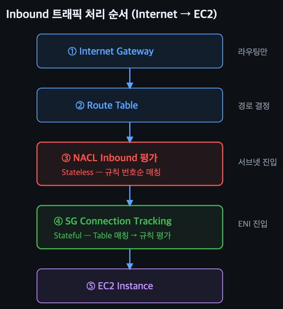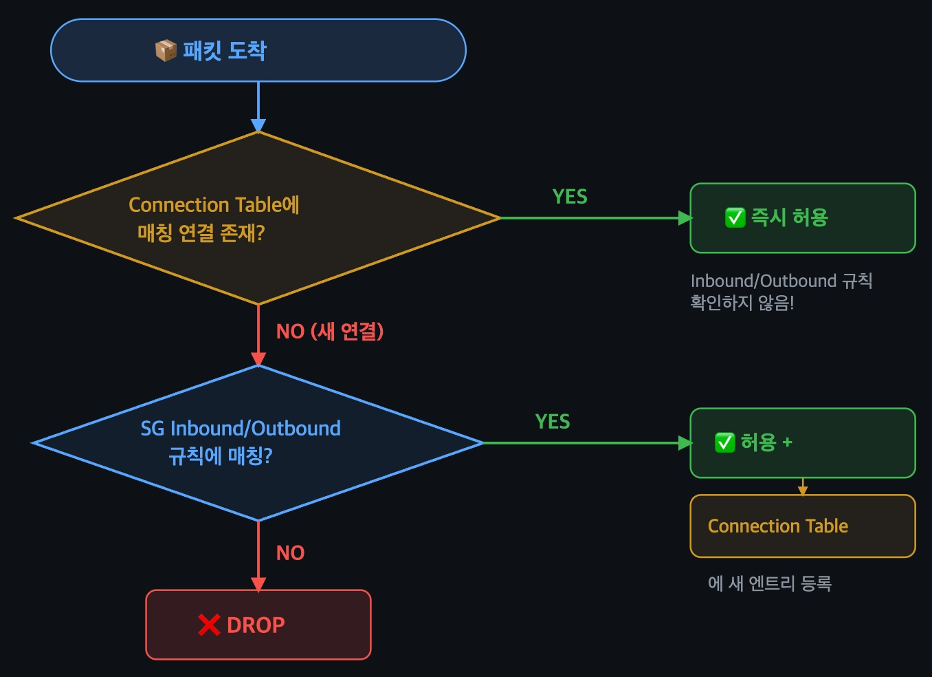 여기서 하나만 기억하세요. Security Group은 "이 패킷이 허용 목록에 있는가?"를 묻지 않습니다. "이 패킷이 이미 추적 중인 연결에 속하는가?"를 먼저 묻습니다.