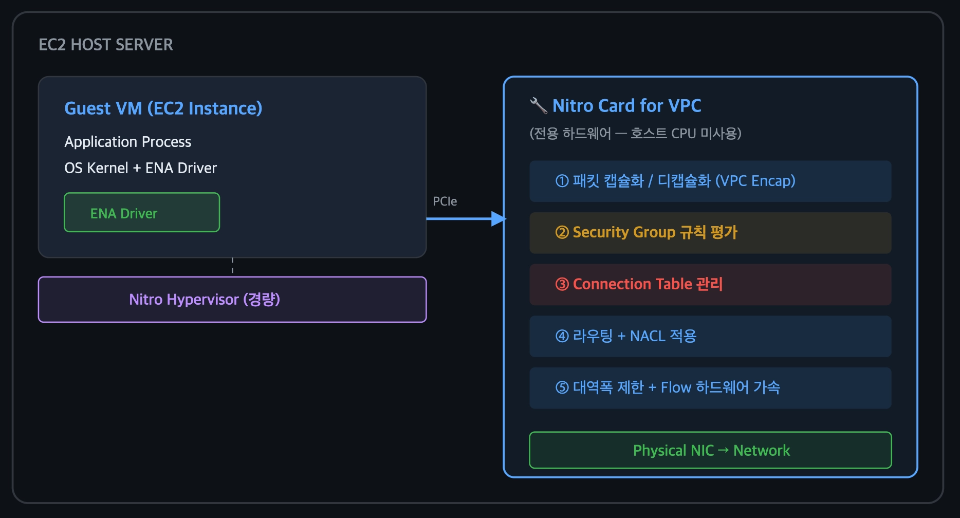 VPC 네트워킹의 핵심 기능들 — 패킷 캡슐화/디캡슐화, Security Group 적용, 라우팅, 대역폭 제한 — 이 모두 Nitro Card for VPC라는 전용 하드웨어에서 수행됩니다. 호스트 CPU를 전혀 쓰지 않습니다.